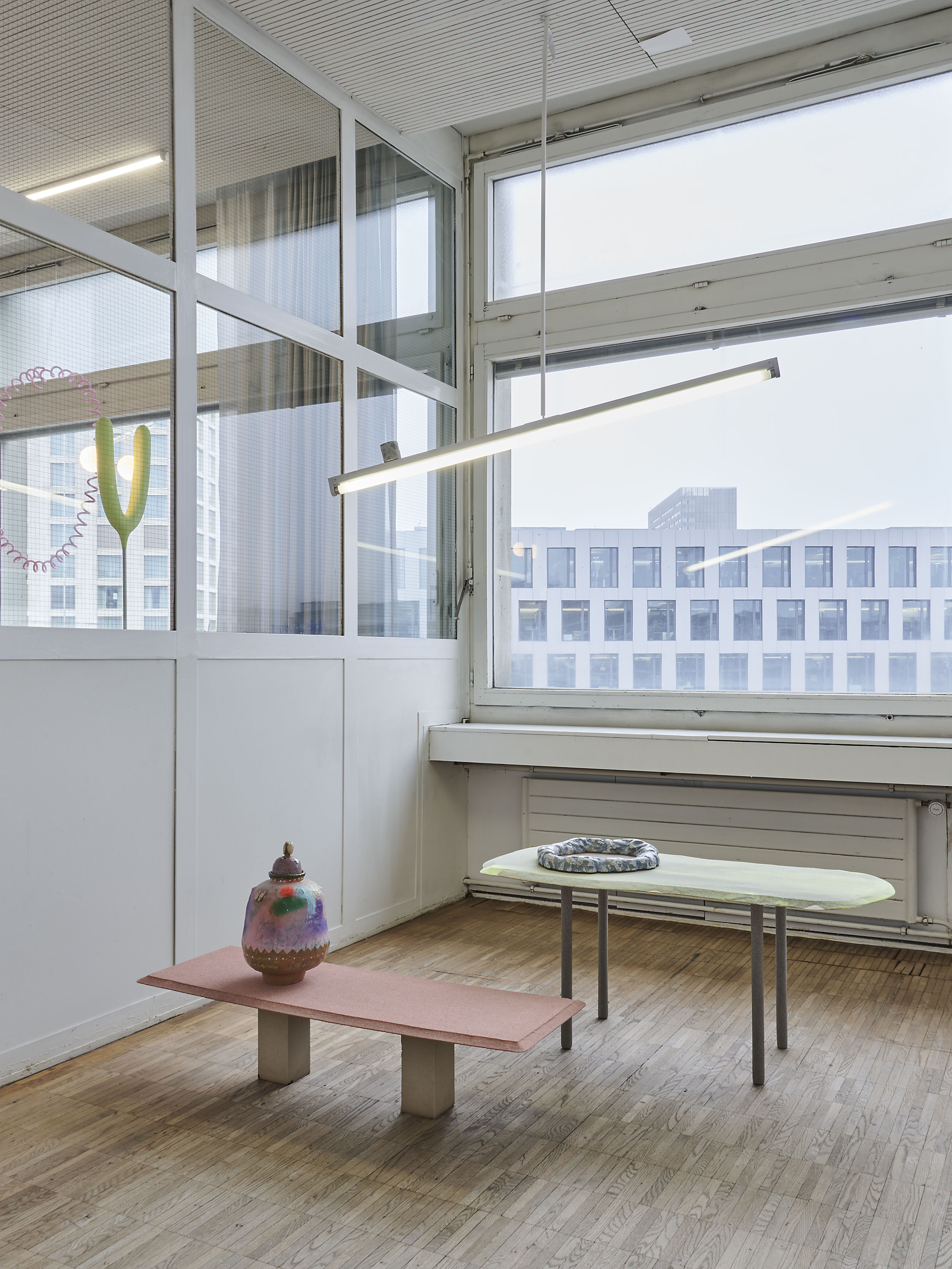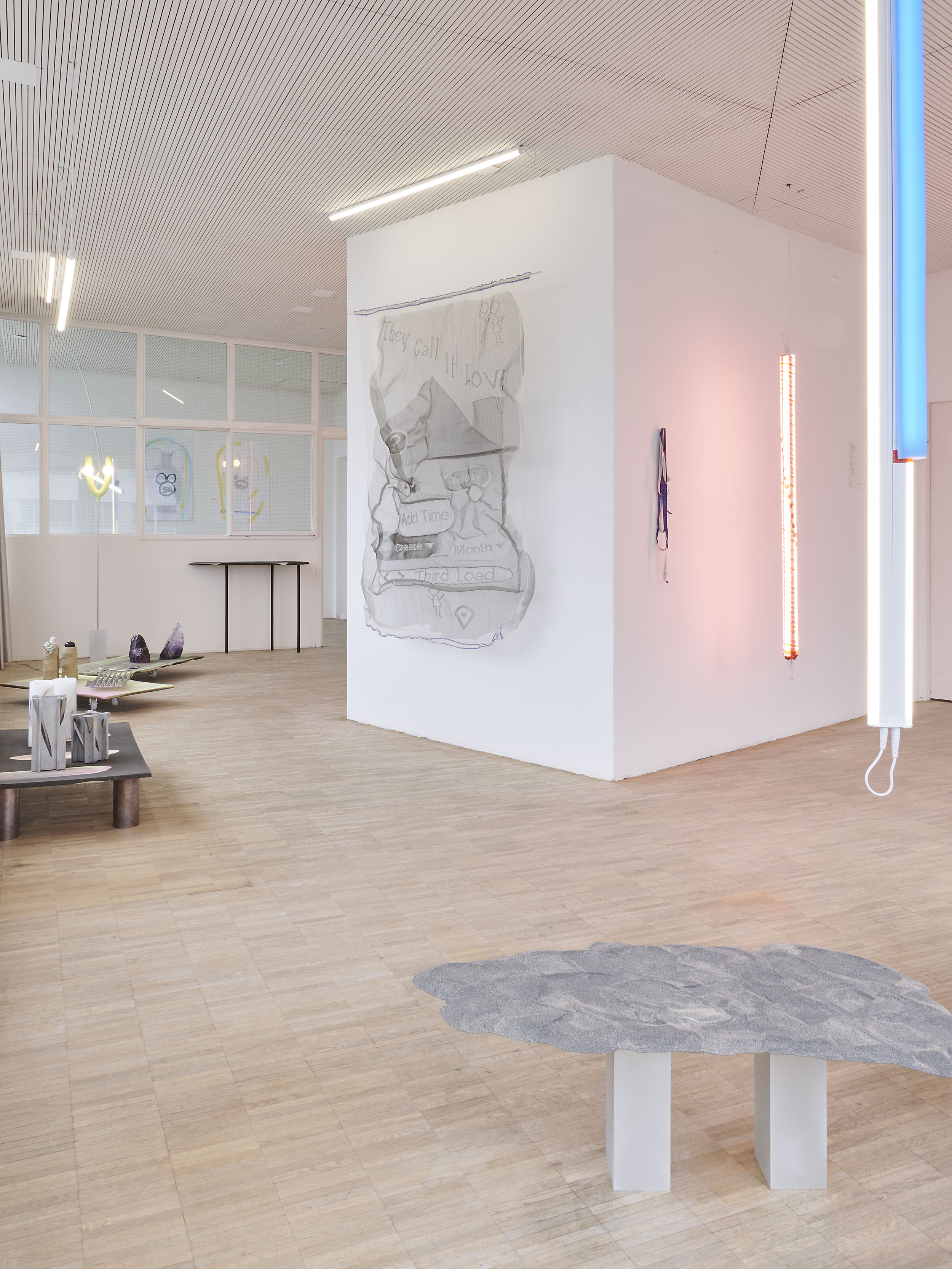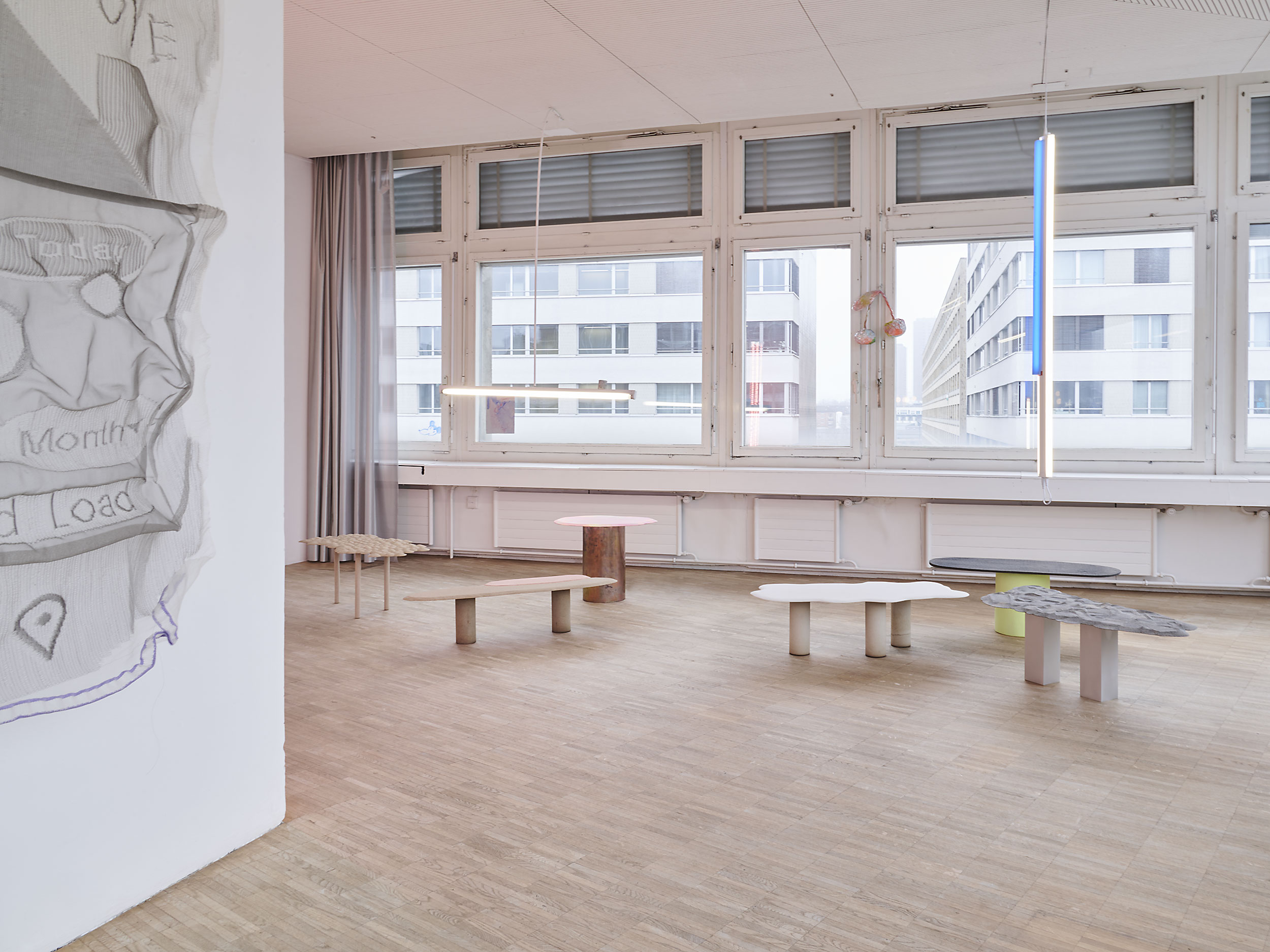 Douglas Mandry contributes blown-glass forms derived from glacier-mill scans alongside overprinted offset plates from a recent research and book project. Zato (Stefan Liniger) intervenes directly in the space, removing existing ceiling fixtures and reconfiguring them with rods, tape, and exhibition materials. As daylight fades, the room settles into softer light and muted colour hues.